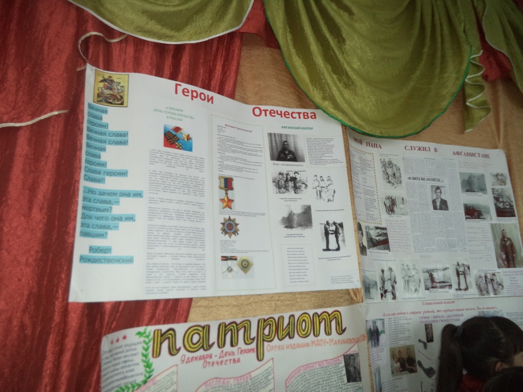 Команда «Патриоты» нашей школы под руководством педагога- организатора Пузановой О.В. в конкурсе «Визитная карточка» заняла 2 место. В конкурсе «Возьми в пример себе Героя» и конкурсе стенгазет «Герои Отечества» наша команда заняла первые места.