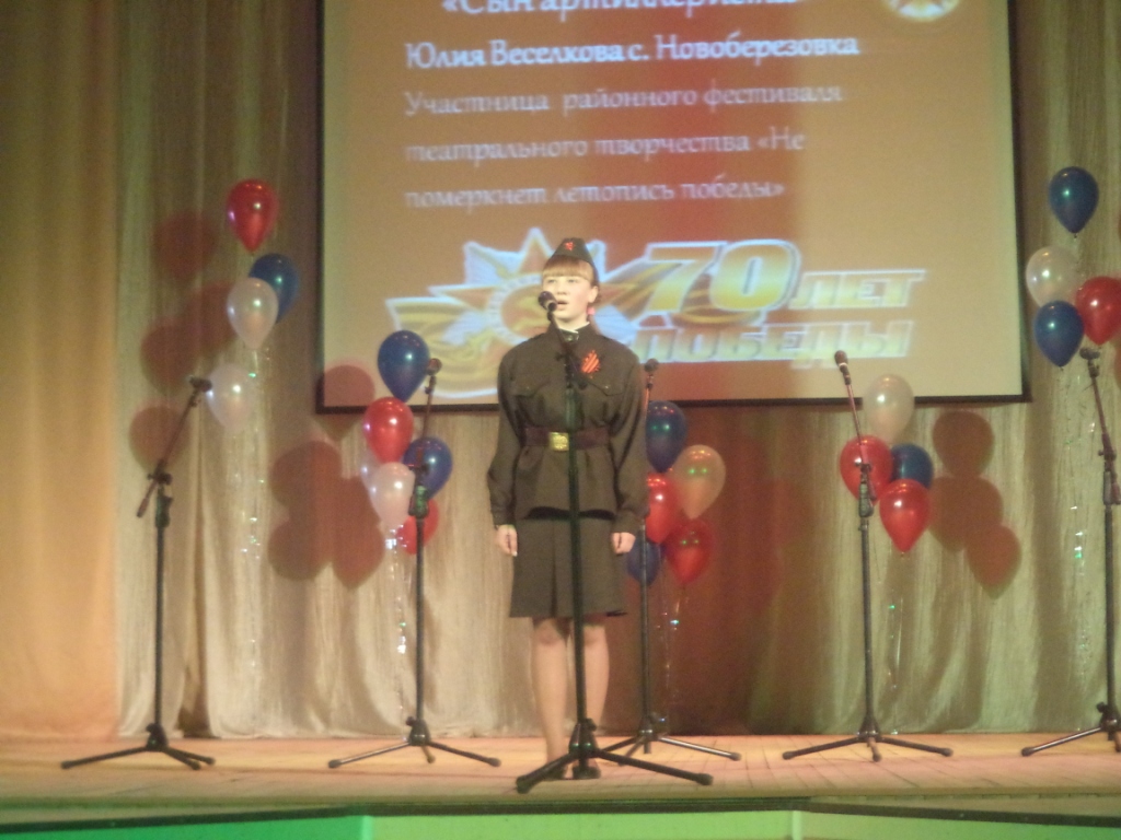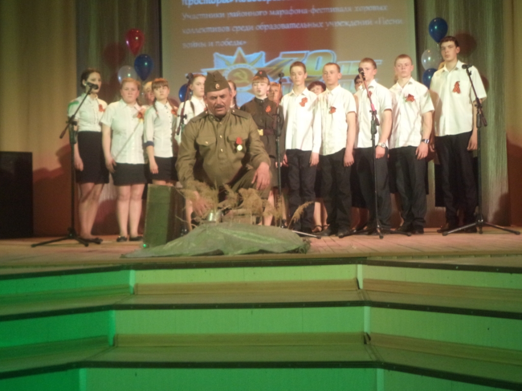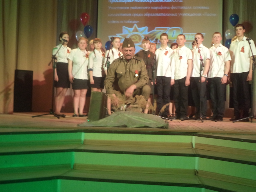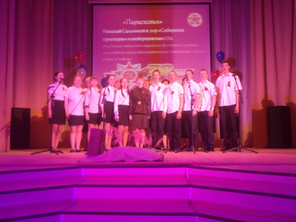 На гала-концерте учащиеся нашей школы приняли самое активное участие. Настоящий фурор произвело выступление Татьяны Козлюк. На самом же деле это всего лишь шестилетняя Танюшечка — участница районного фестиваля народного творчества «Не померкнет летопись Победы». Она прочитала стихотворение «Чулочки» и сделала это с такой детской непосредственностью, выразительностью и проникновением, что не прослезившихся в зале не осталось. С подобным волнением выслушали зрители стихотворение «Сын артиллериста» в исполнении Юлии Веселковой. Хор «Сибирские просторы», организованный Пузановой О.В. показал инсценировку песни «Прасковья».