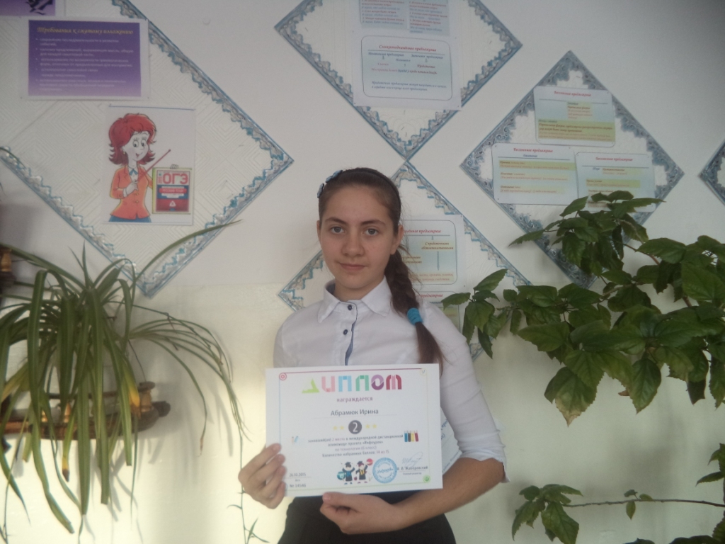 Ученица 6 класса Абрамюк Ирина в октябре месяце приняла участие в Международной дистанционной олимпиаде по технологии «Инфоурок» и получила диплом 2 степени. Ирина набрала 14 баллов из 15 возможных. Ирочка! Вся школа поздравляет тебя. Ты «Молодечик!»