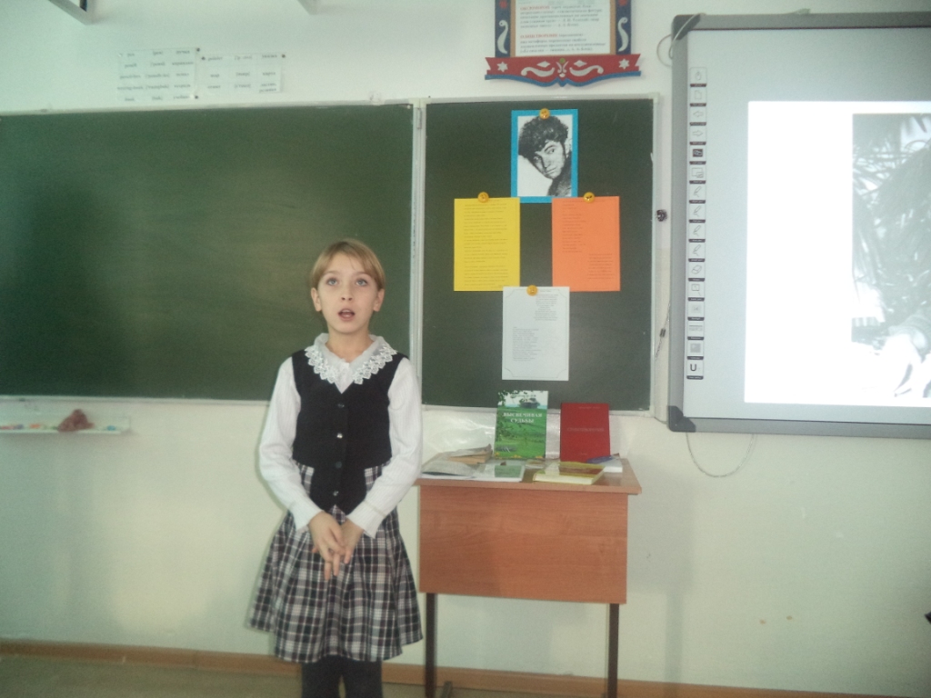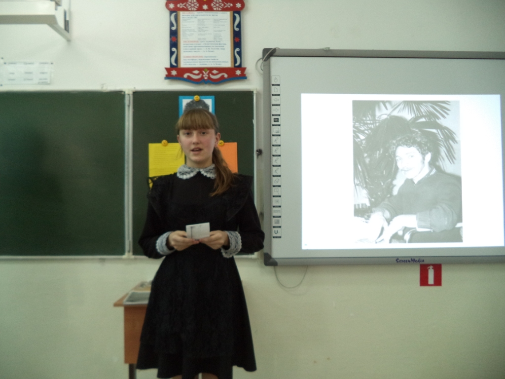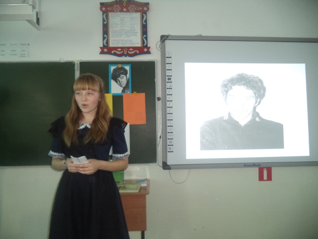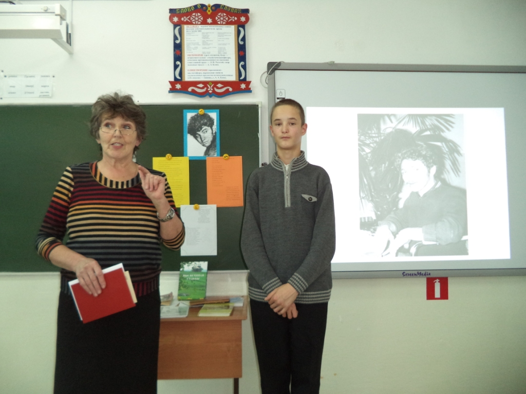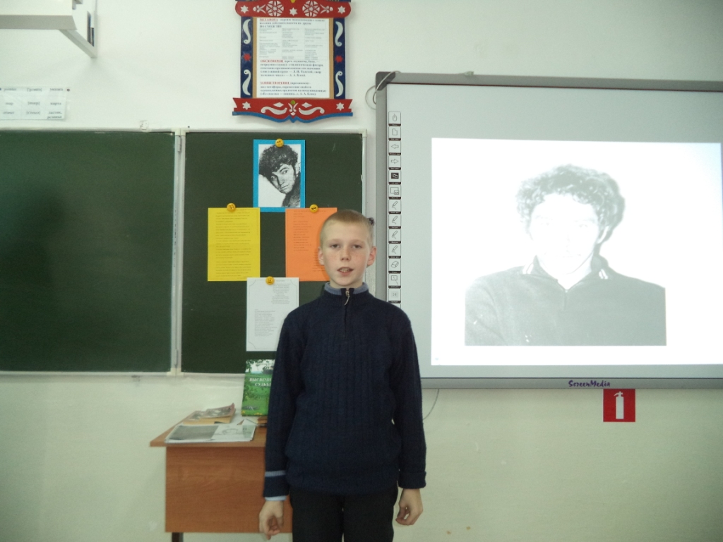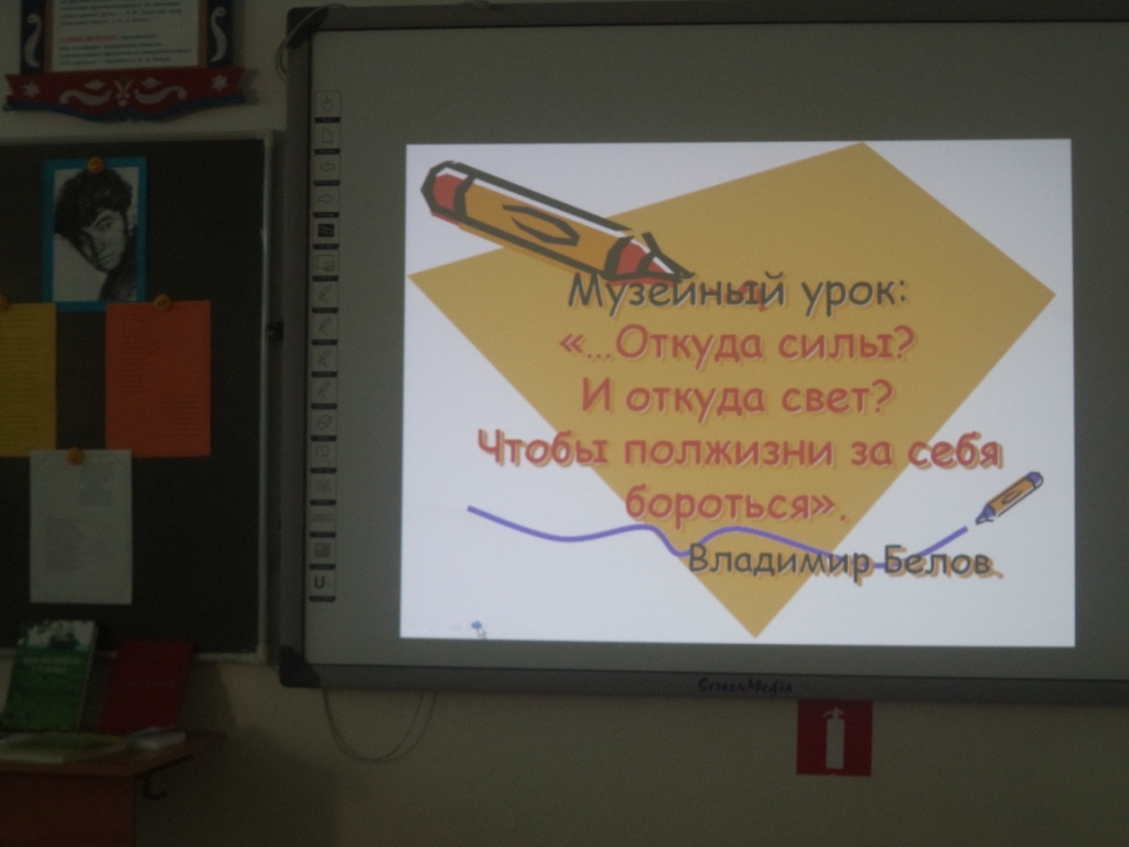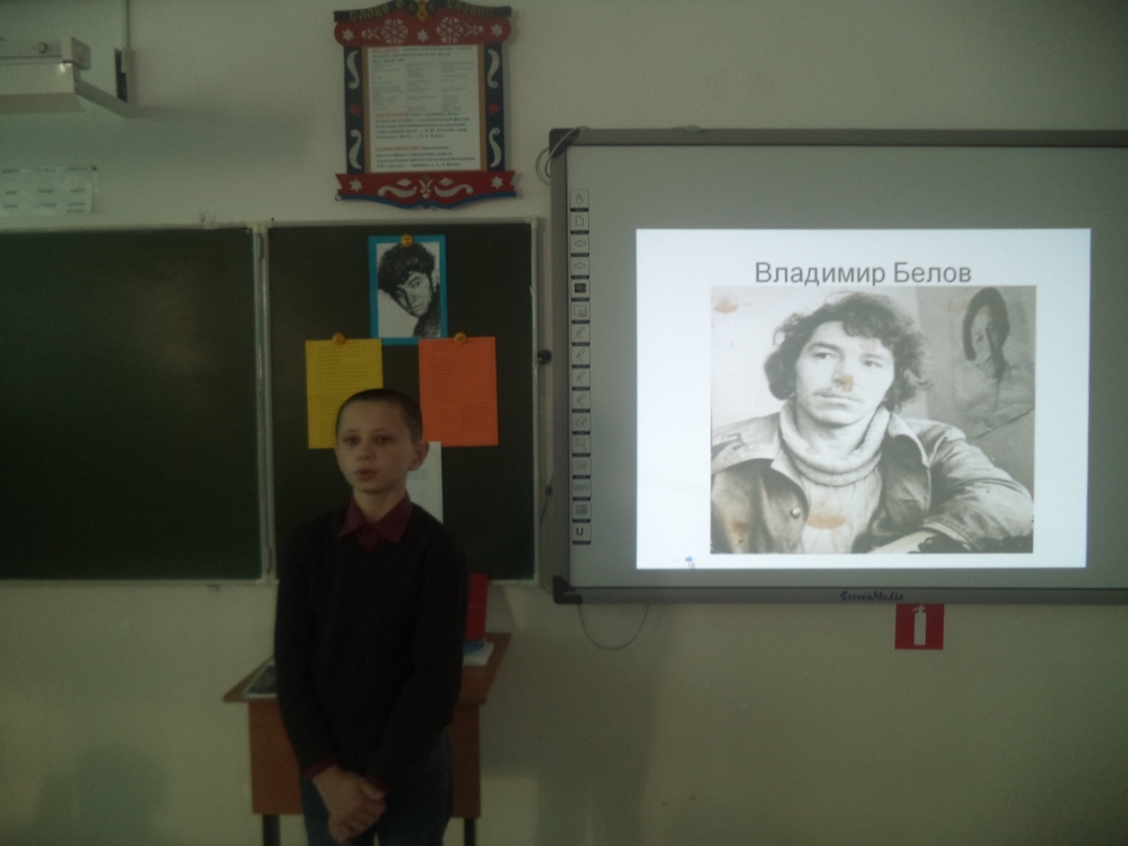 27 октября в день рождения Владимира Белова в нашей школе прошёл музейный урок «Откуда силы? И откуда свет? Чтобы полжизни за себя бороться». Провела этот урок учитель русского языка и литературы Юсько О.Е. Целью этого урока было: прикоснуться к стихам В.Белова, почувствовать всю прелесть и красоту слога; показать ощущение собственной силы, её избытка, её нерастраченности в творчестве В.Белова. Сказано, что В.Белов умел «открывать души». И это ярко проявилось в чтении стихов ребятами: Абрамюк И. «Возвращаются лебеди с юга», Кутузовой В. «Избёнка», Леонюк А. «Нам умереть бесследно не дано…» Стихи его плещутся,переполнены чувствами. В стихах он оставлял себя, стихами шагнул в бессмертие.