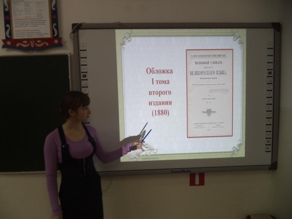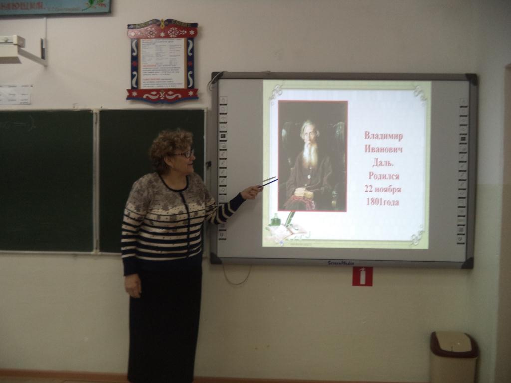 На уроках «Биографы» познакомили ребят с биографией выдающегося человека Владимира Ивановича Даля. Группа «Театралы» в небольшой сценке показали, с чего начинался великий труд В.Даля. В каждом классе прошла работа со словарём Даля, ребята выбирали пословицы из «Толкового словаря живого великорусского языка» В.И.Даля и указывали их лексическое значение и значение выделенных слов. В конце урока ребята просмотрели презентацию о жизни и творчестве Даля и пришли к выводу, что словарь Даля всегда будет спутником не только литератора, филолога, но и всякого образованного человека, интересующегося русским языком.