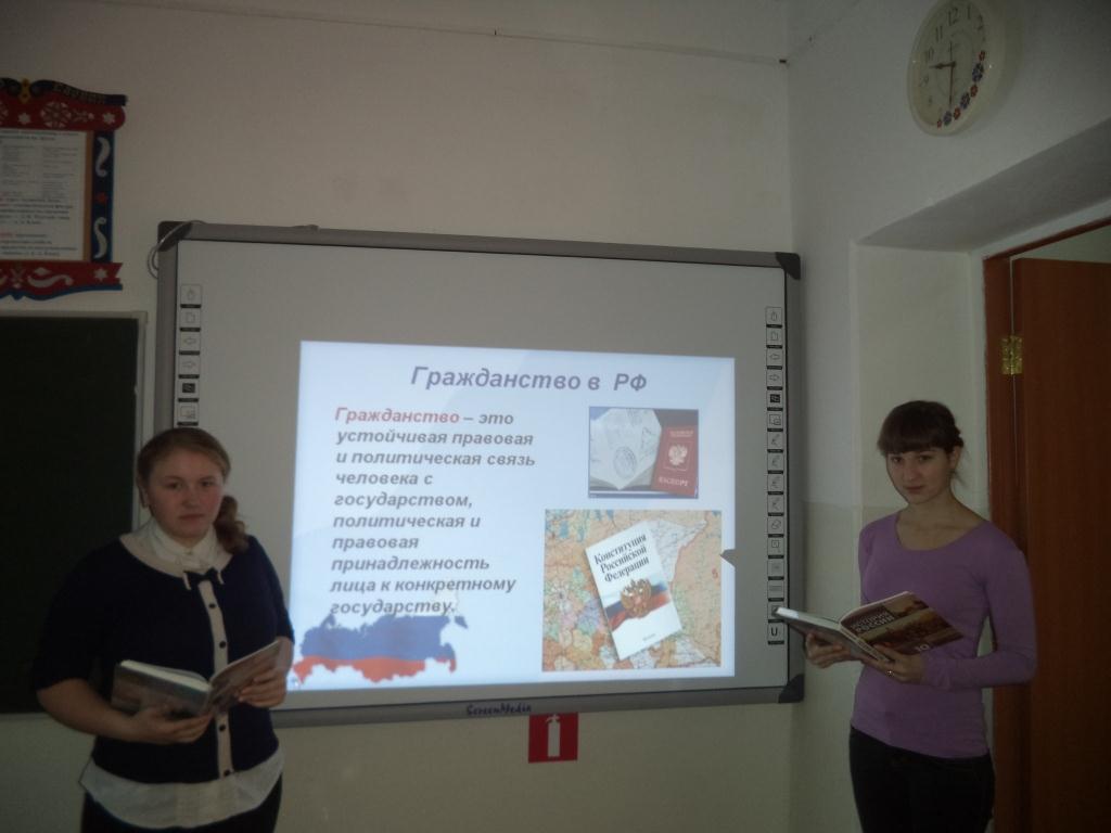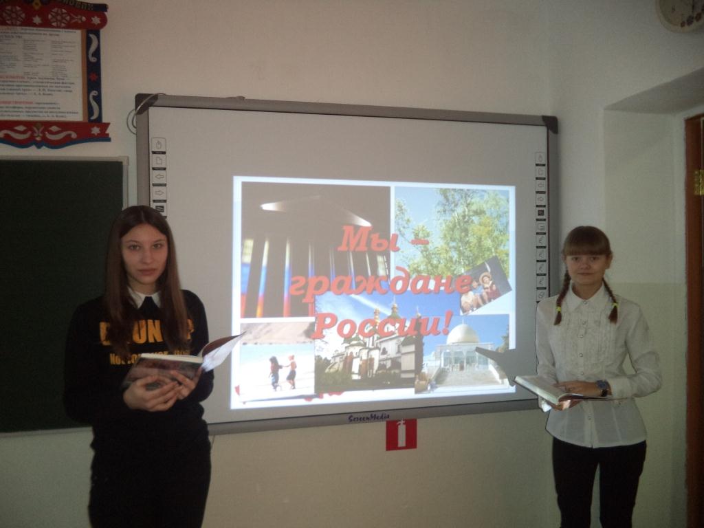 14 декабря педагог-организатор нашей школы Пузанова О.В. провела урок с показом презентации на тему «Мы граждане России», посвящённый Дню Конституции. Ребята уяснили, что самые главные правила, которые установили для себя граждане нашей страны, записаны в Конституции РФ. Конституция – это основной закон нашего государства. В прошлом году Конституции РФ – 12 декабря было уже 20 лет. После просмотра презентации ученики вместе с учителем работали по книге «Конституция РФ». Особое внимание было уделено статье 43, которая имеет непосредственное отношение к школьникам: «Каждый человек имеет право на образование …». Далее по очереди ребята читали по книжке, какие же права и обязанности есть у них. В конце урока предоставили слово гостям. Гости в своем выступлении рассказали о том, как Основной закон применяется на их рабочем месте. Гости нацелили ребят на ответственное отношение к своим правам и обязанностям в школе.